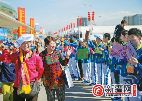 2016年9月25日,第五屆中國—亞歐博覽會圓滿落幕。亞歐博覽會的志愿者們舉著“大美新疆歡迎您”“后會有期”“中國—亞歐博覽會歡迎您再來”等祝福語,在新疆國際會展中心西門列隊歡送參展商和觀眾。圖為當日14 時50 分,來自重慶的游客陳女士揮手向志愿者們道別。(記者蔣曉攝)