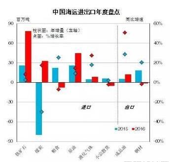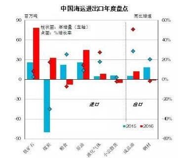 2016年中國干散貨出口整體表現(xiàn)不佳,而液散出口則接棒成為推動(dòng)中國海運(yùn)出口量增長的主要力量。